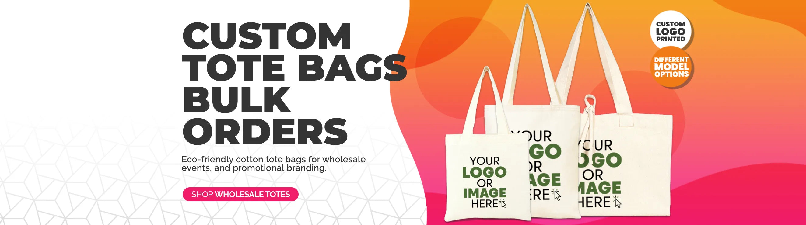 Absolutely! We specialize in custom tote bags for weddings, events, trade shows, and promotional branding. You can choose from a wide range of sizes and printing options to fit your needs.