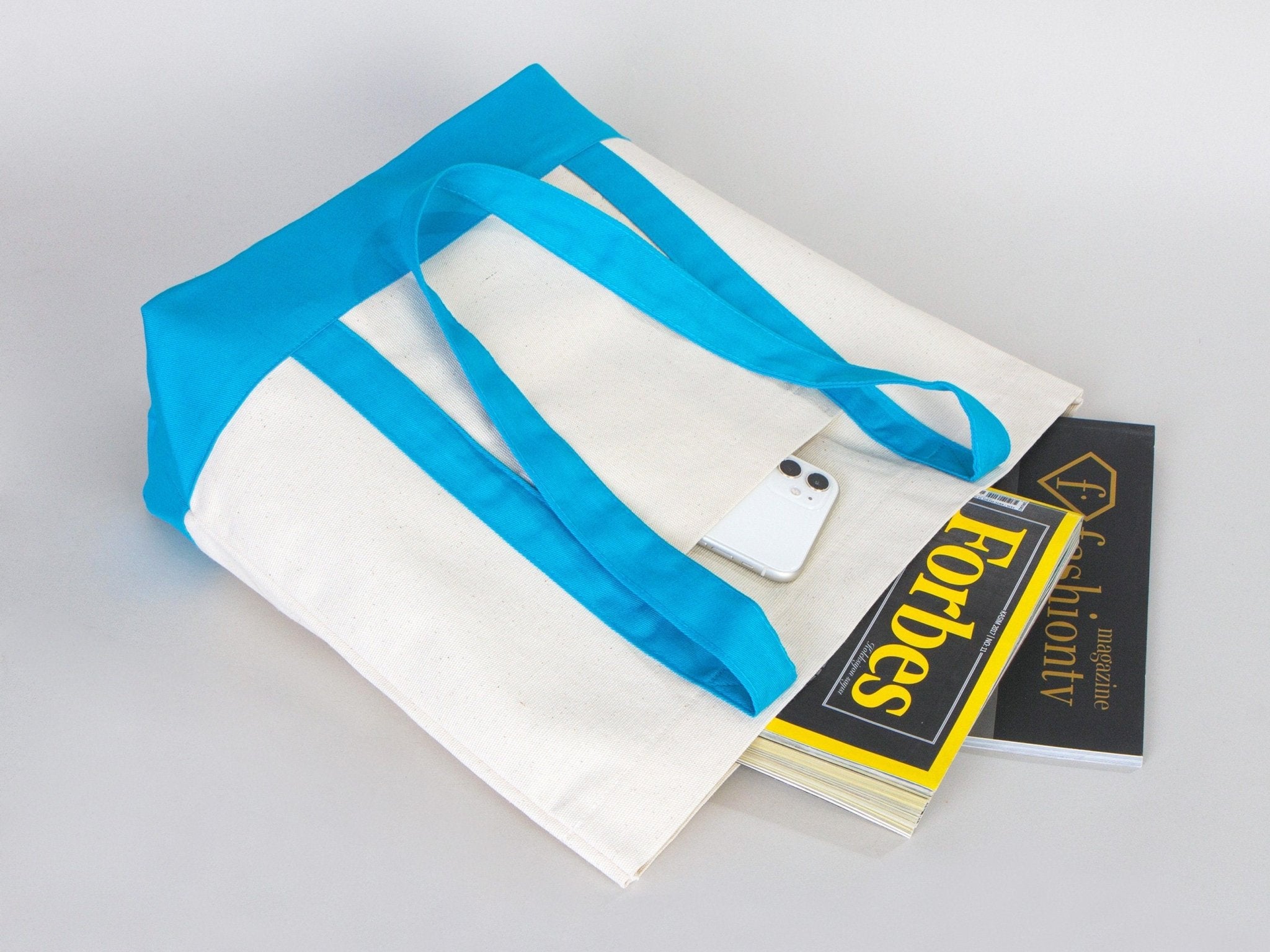 Large Trend Canvas Shopping Bag with Turquoise Handle, 16"W x 14"H x 5"L, Large Tote Bag 12 Oz, Personalized