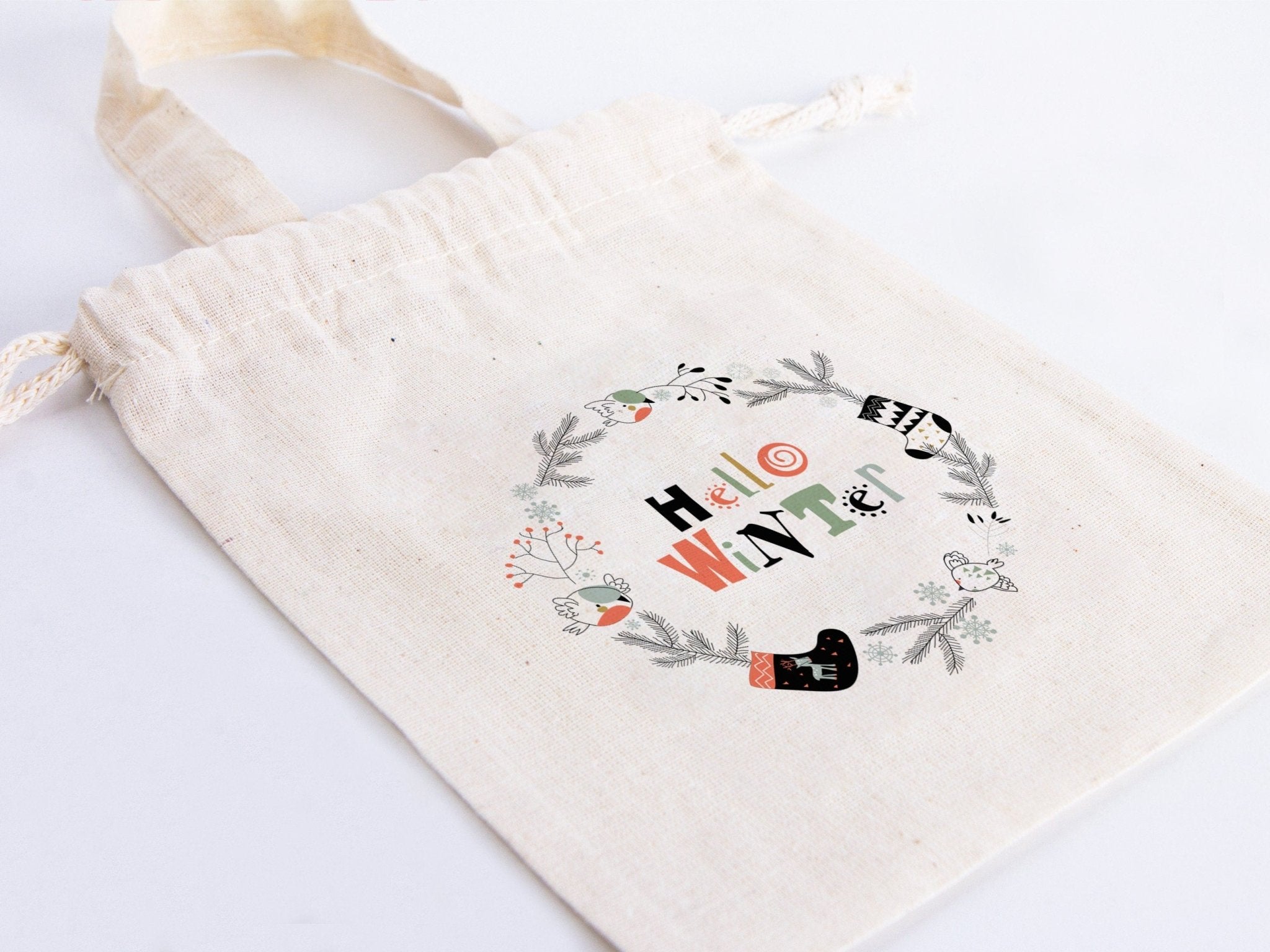 Hello Winter Gift Bags - Custom Family or Company Bags, Add Logo & Text, Personalized Cotton Bags