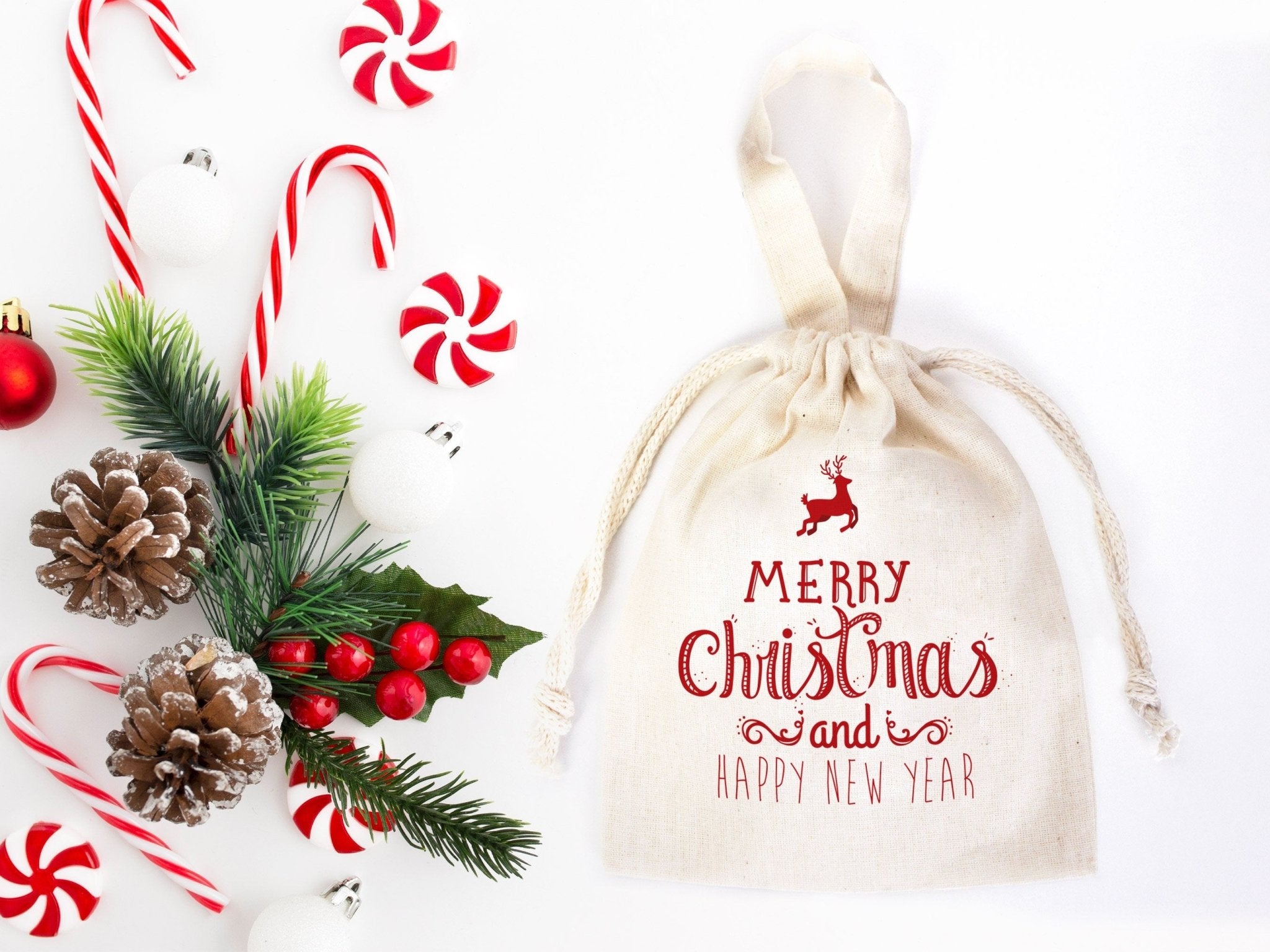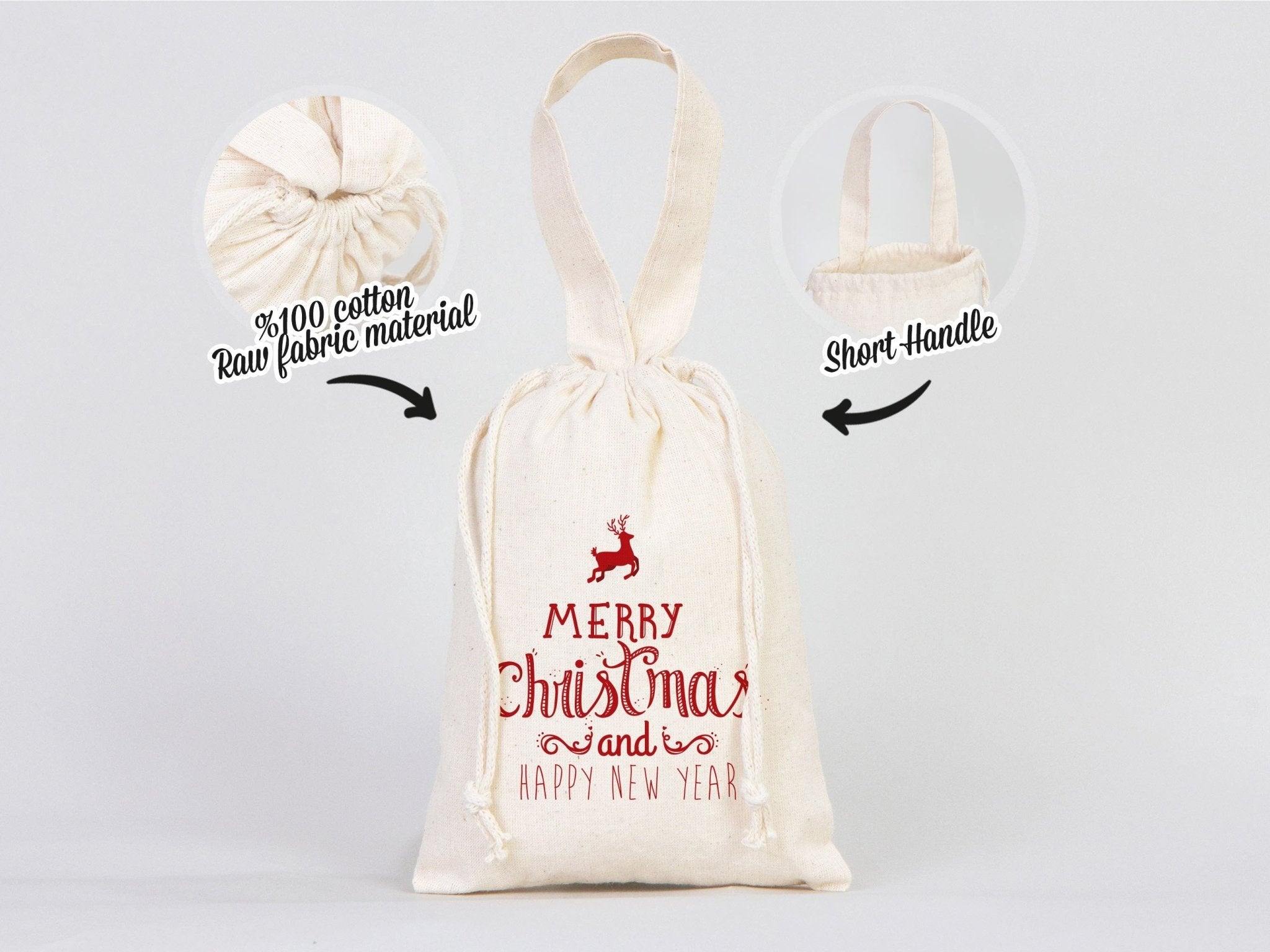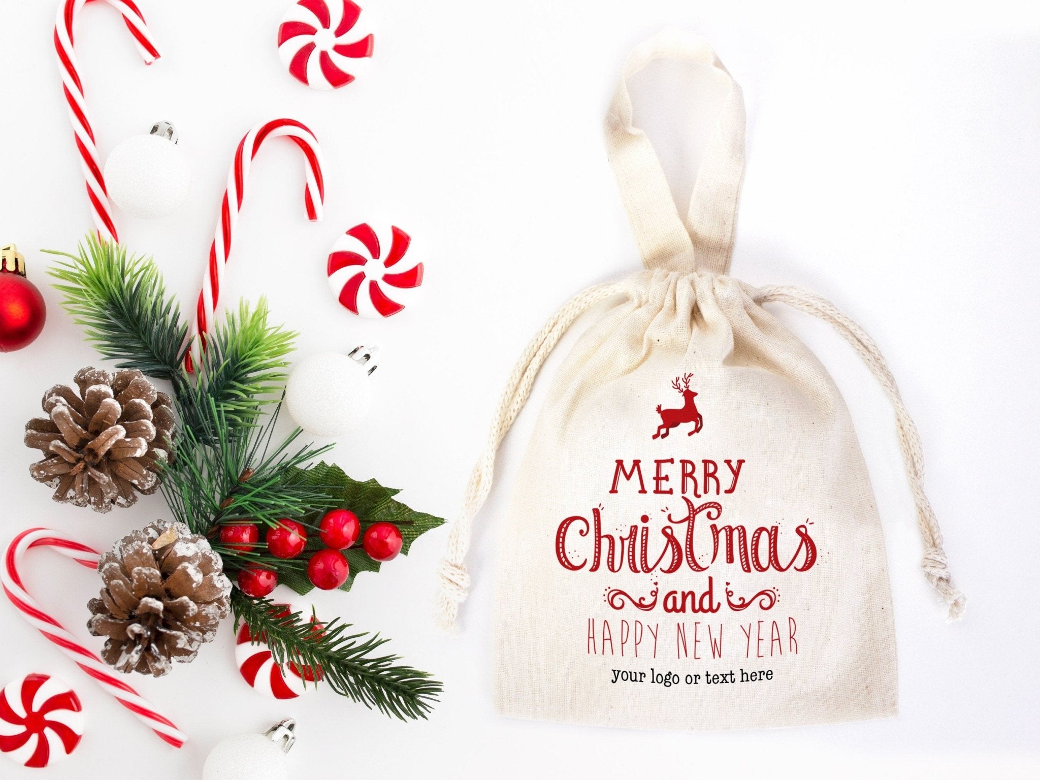 Merry Christmas and New Year Cotton Bags – Custom Family or Company Gift Pouches with Logo & Text