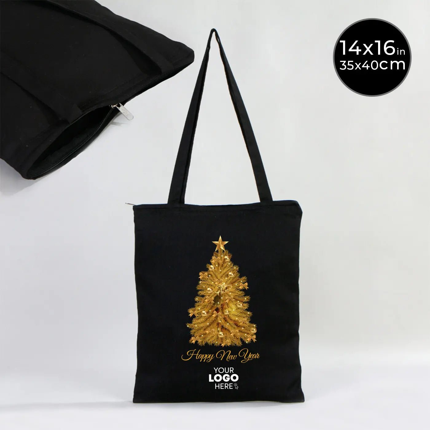 New Year Cotton Tote Bag with Zipper – Black 14" × 16" (35 × 40 cm) Custom Printed Gift Bag