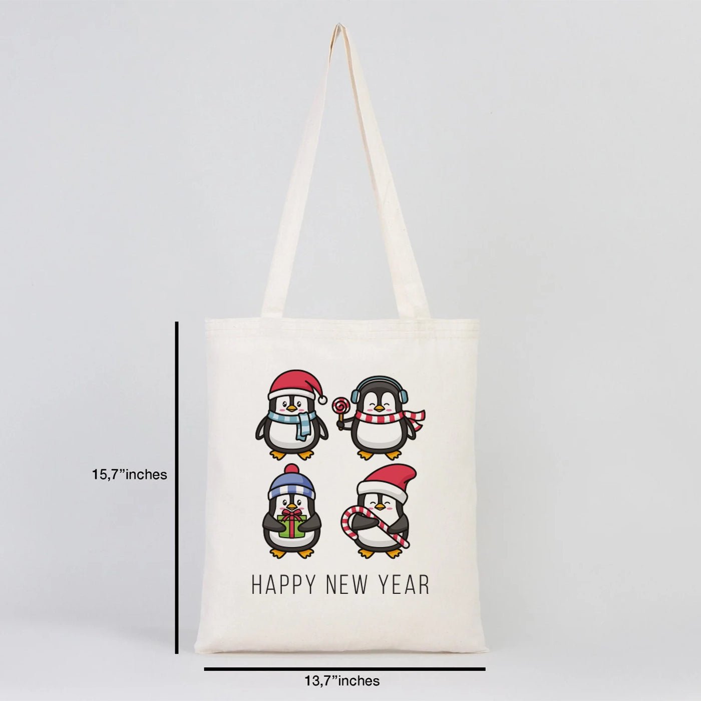 New Year Tote Bag 14" × 16" (35 × 40 cm) – Natural Cotton Fabric with Cute Penguin Holiday Design