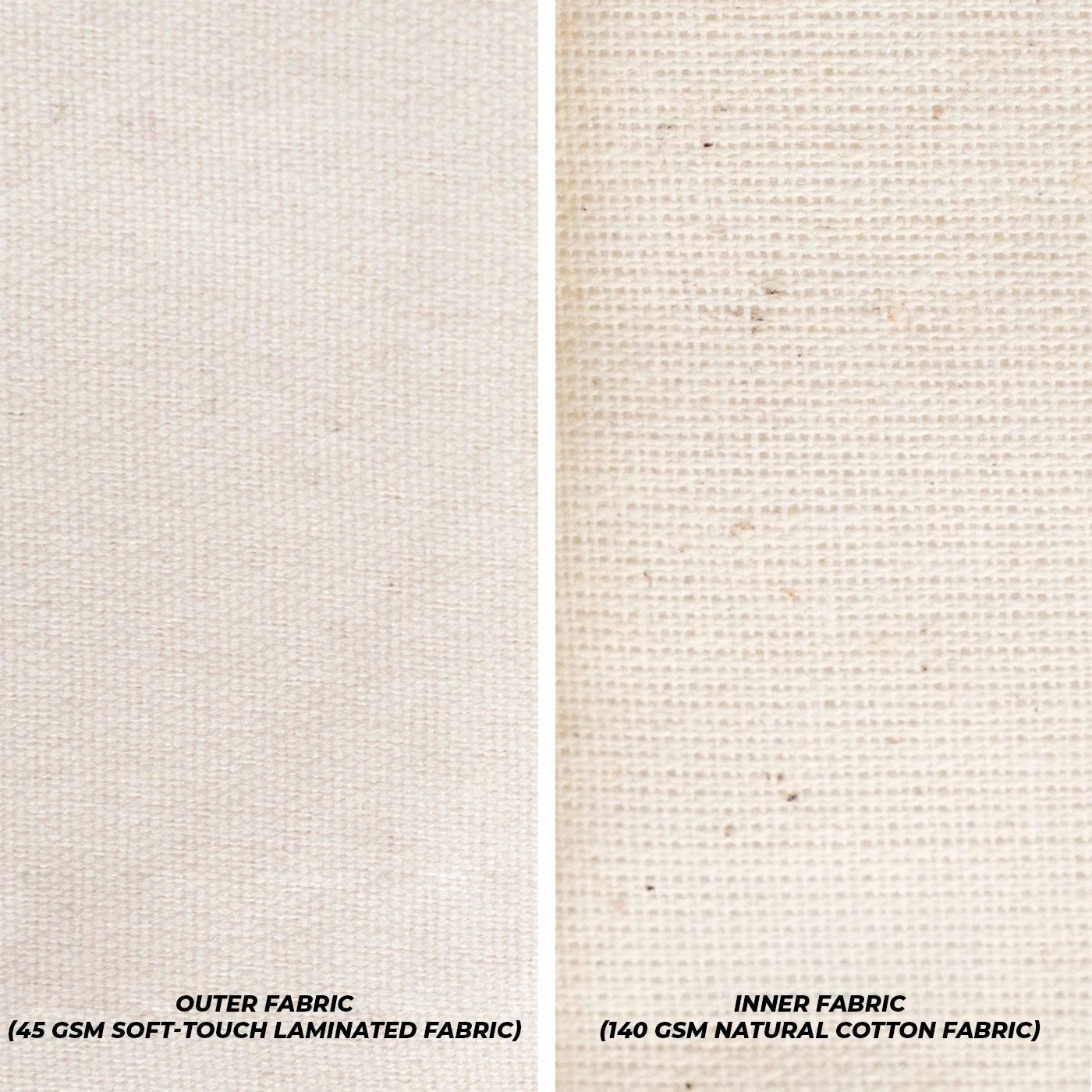 Material: Exterior: Soft-touch laminated fabric (45 g), Interior: 100% cotton lining (140 g raw cotton fabric)