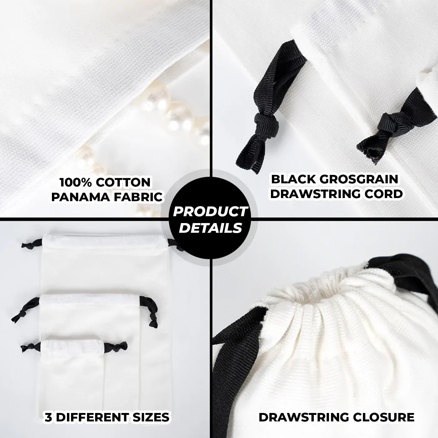 - High Quality: Made from 100% cotton in White (PFD) color using durable 280 gsm Panama/Canvas fabric. The rose-style drawstring closure and black-colored drawstring cord provide both functionality and a stylish look. Your custom design—logo, text, initials, or artwork—is applied with high precision, ensuring a professional and long-lasting finish.